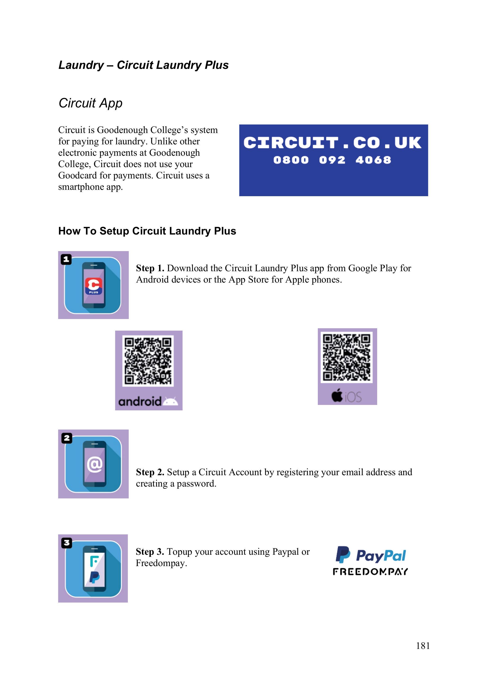 Circuit is Goodenough College’s system for paying for laundry. Unlike other electronic payments at Goodenough College, Circuit does not use your CRRCURT . CO . UK 08000924068 Goodcard for payments. Circuit uses a smartphone app.