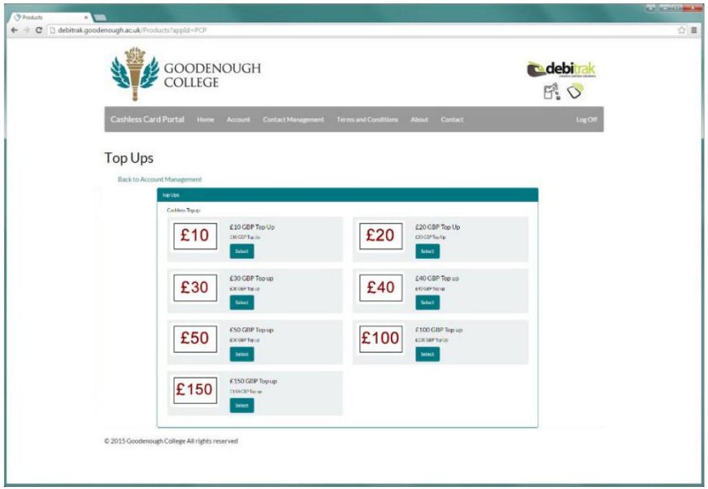There is a choice of 7 top up amounts: $£ 10, £ 20, £ 30, £ 40, £ 50, £ 100$ or £150 but you can only purchase 1 topup item at a time.
