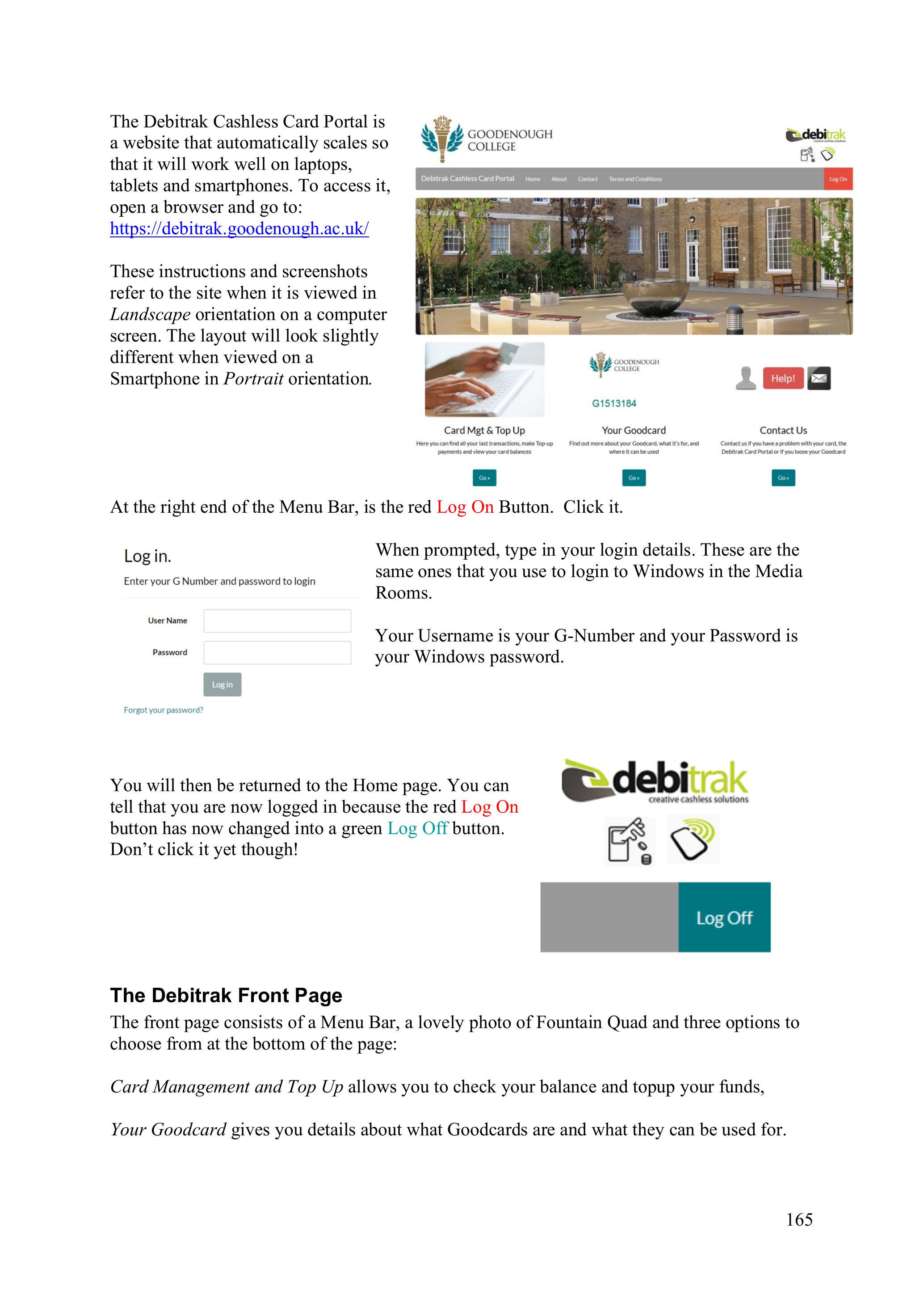 The Debitrak Cashless Card Portal is a website that automatically scales so that it will work well on laptops, tablets and smartphones. To access it, open a browser and go to: https://debitrak.goodenough.ac.uk/