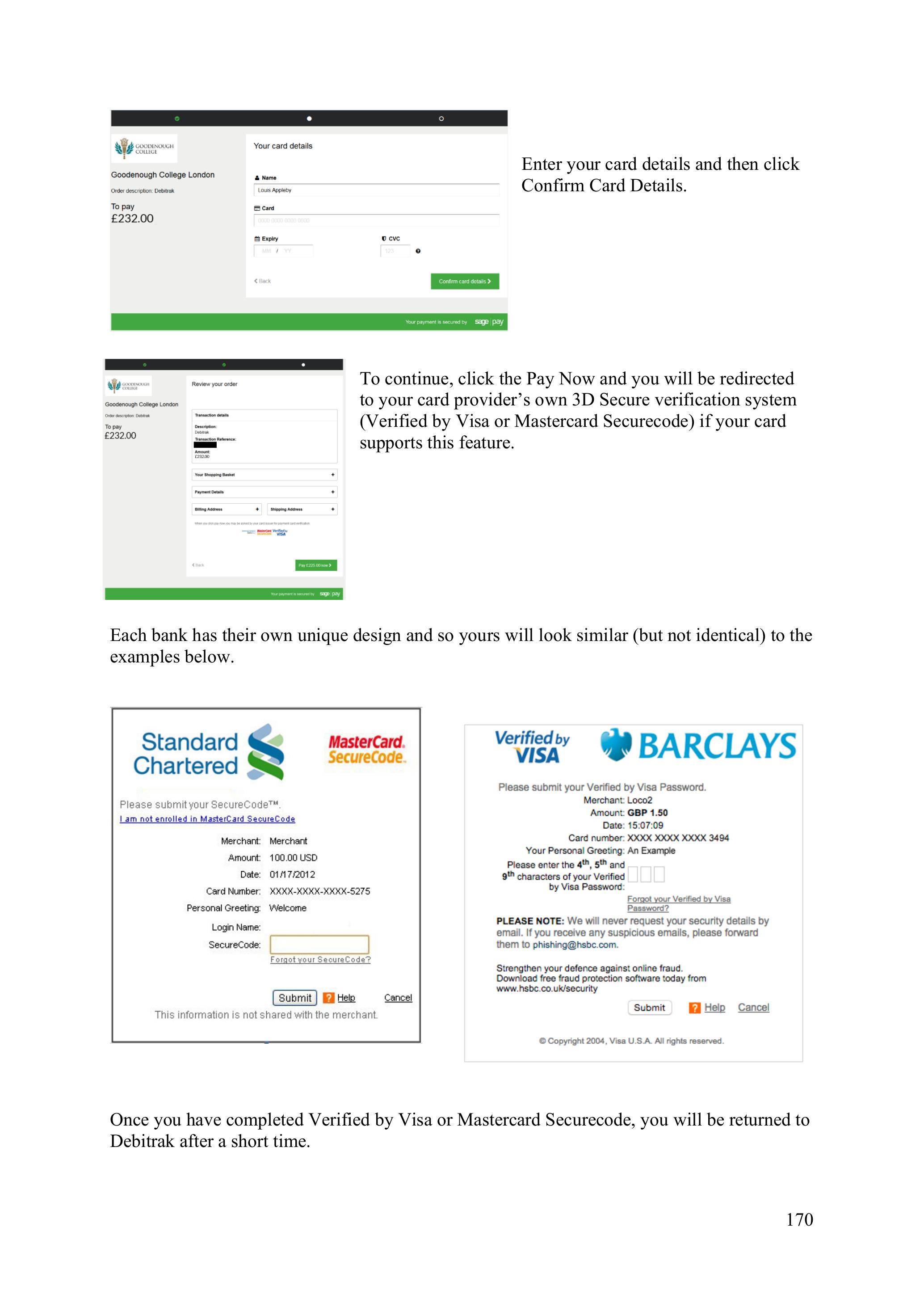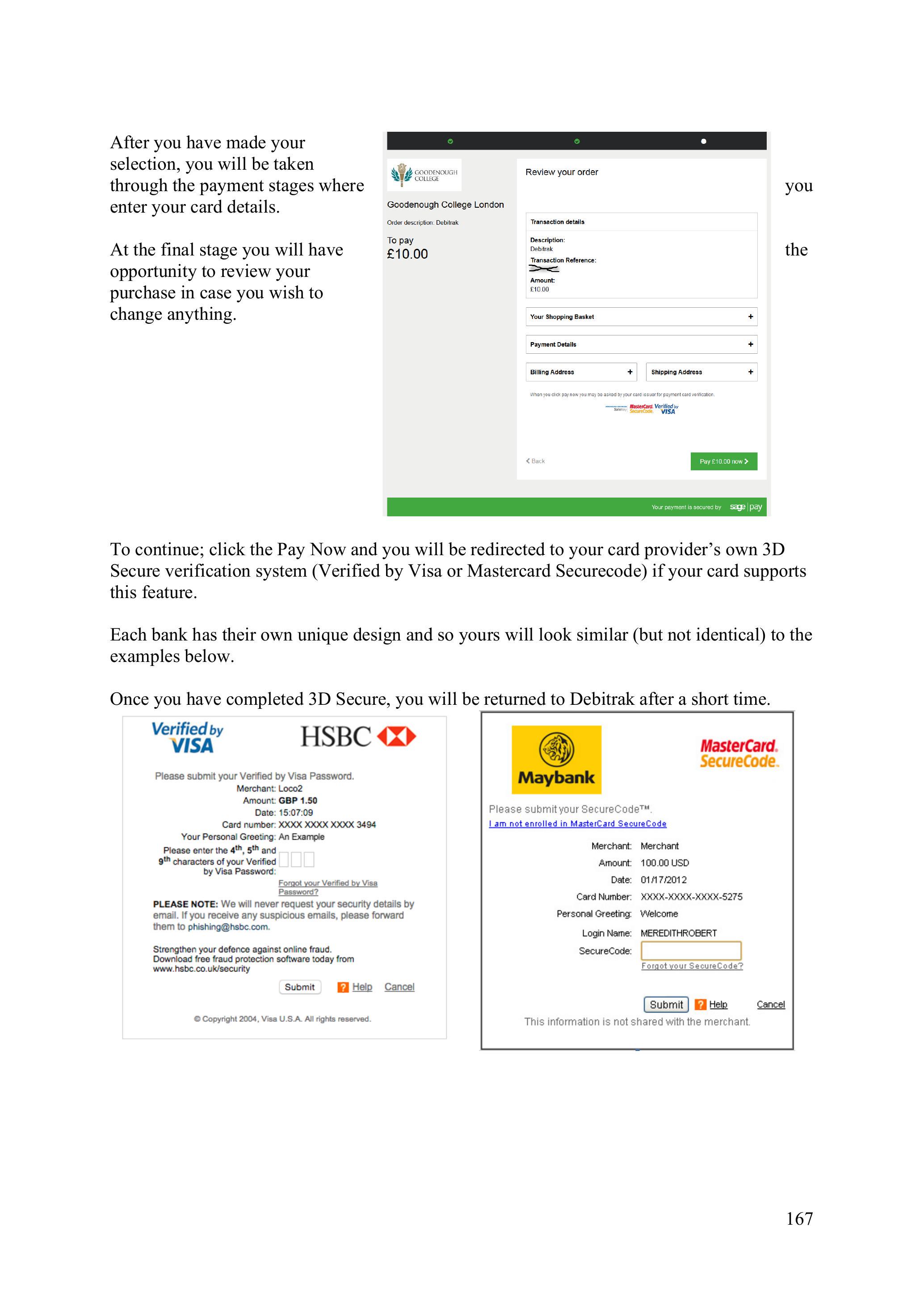 Once you have completed Verified by Visa or Mastercard Securecode, you will be returned to Debitrak after a short time.