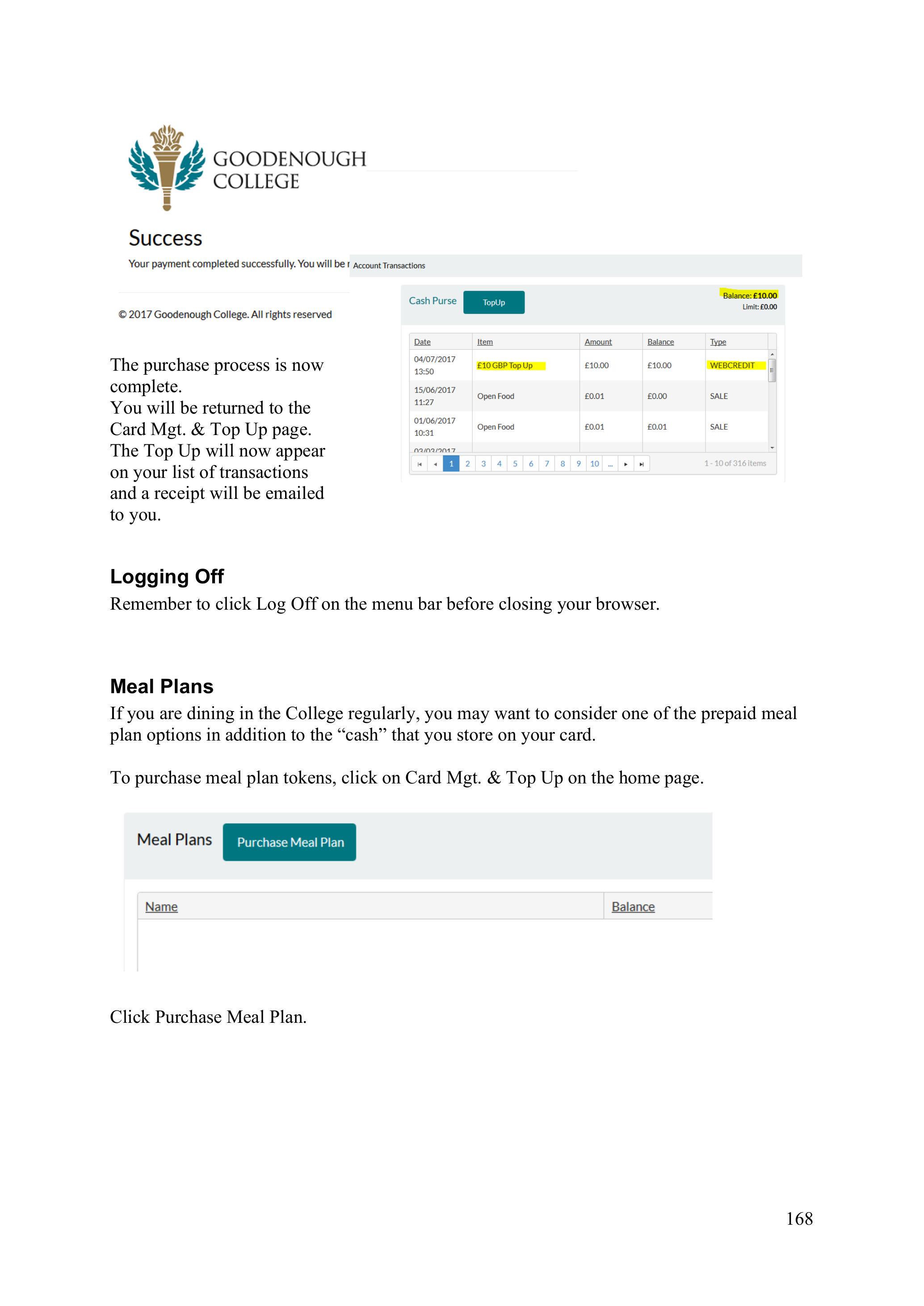 You will be returned to the Card Mgt & Top Up page. The meal plan tokens will now appear on your list of transactions and a receipt will be emailed to you.