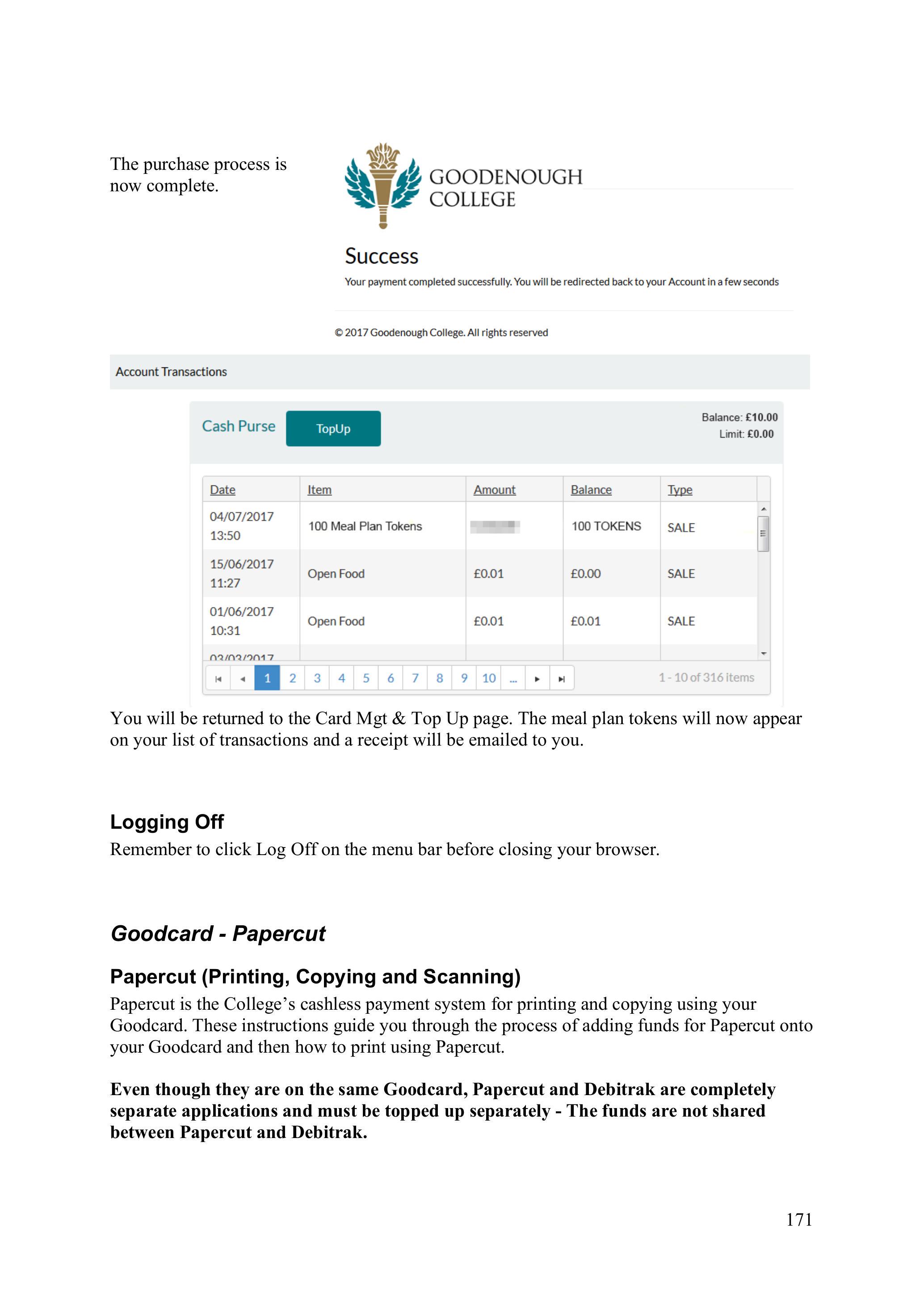 Debitrak is the College’s cashless payment system that enables you to buy food and drink using your Goodcard. These instructions guide you through the process of setting up and adding funds to Debitrak (topping up.) As Debitrak and Papercut are completely separate applications made by different companies, they must be topped up separately - The balance is not shared between Debitrak and Papercut.