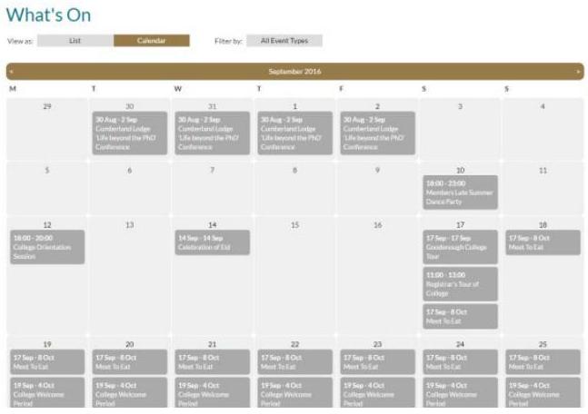 The What’s On page where you can see the latest events as either a list or in a calendar view.