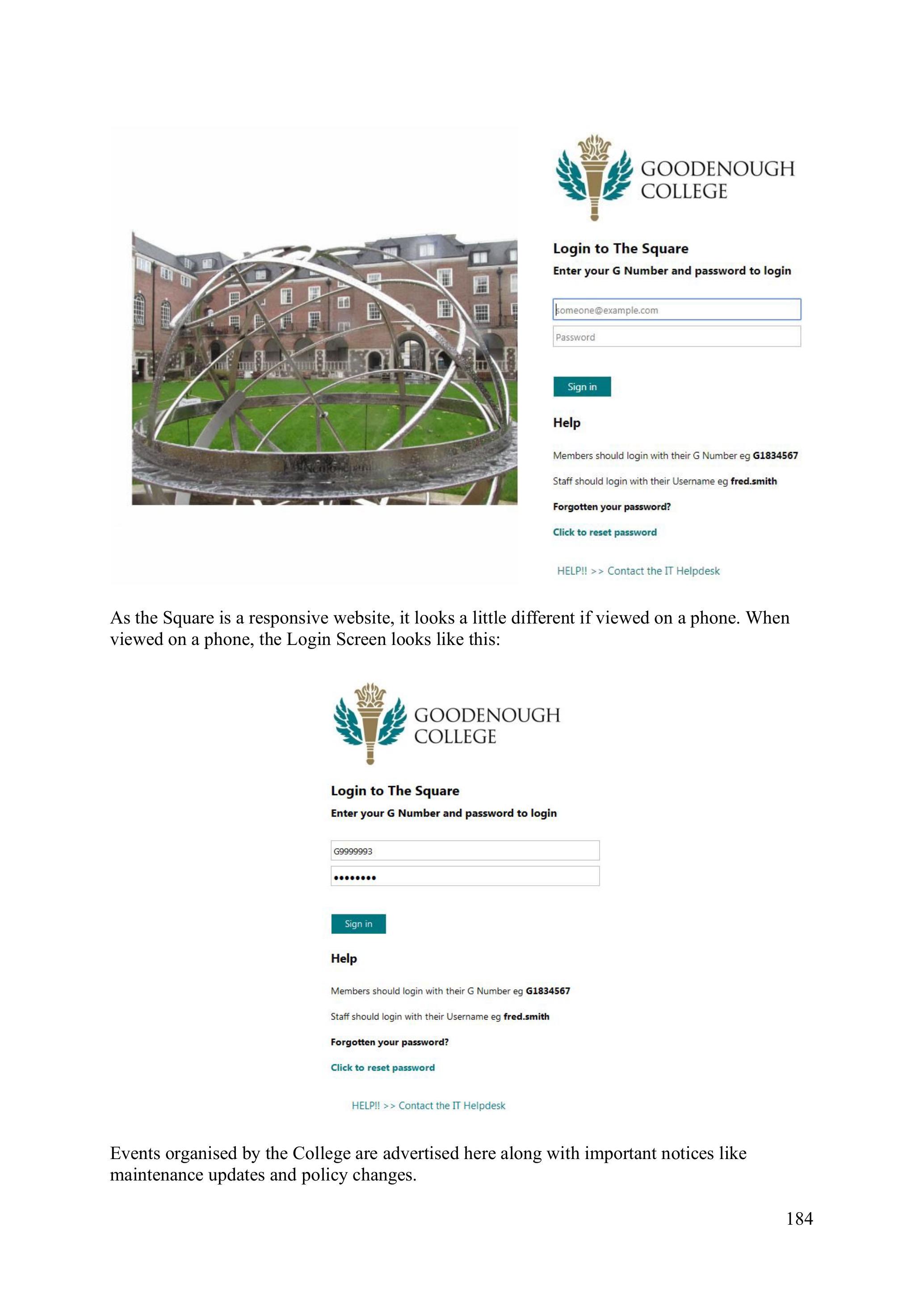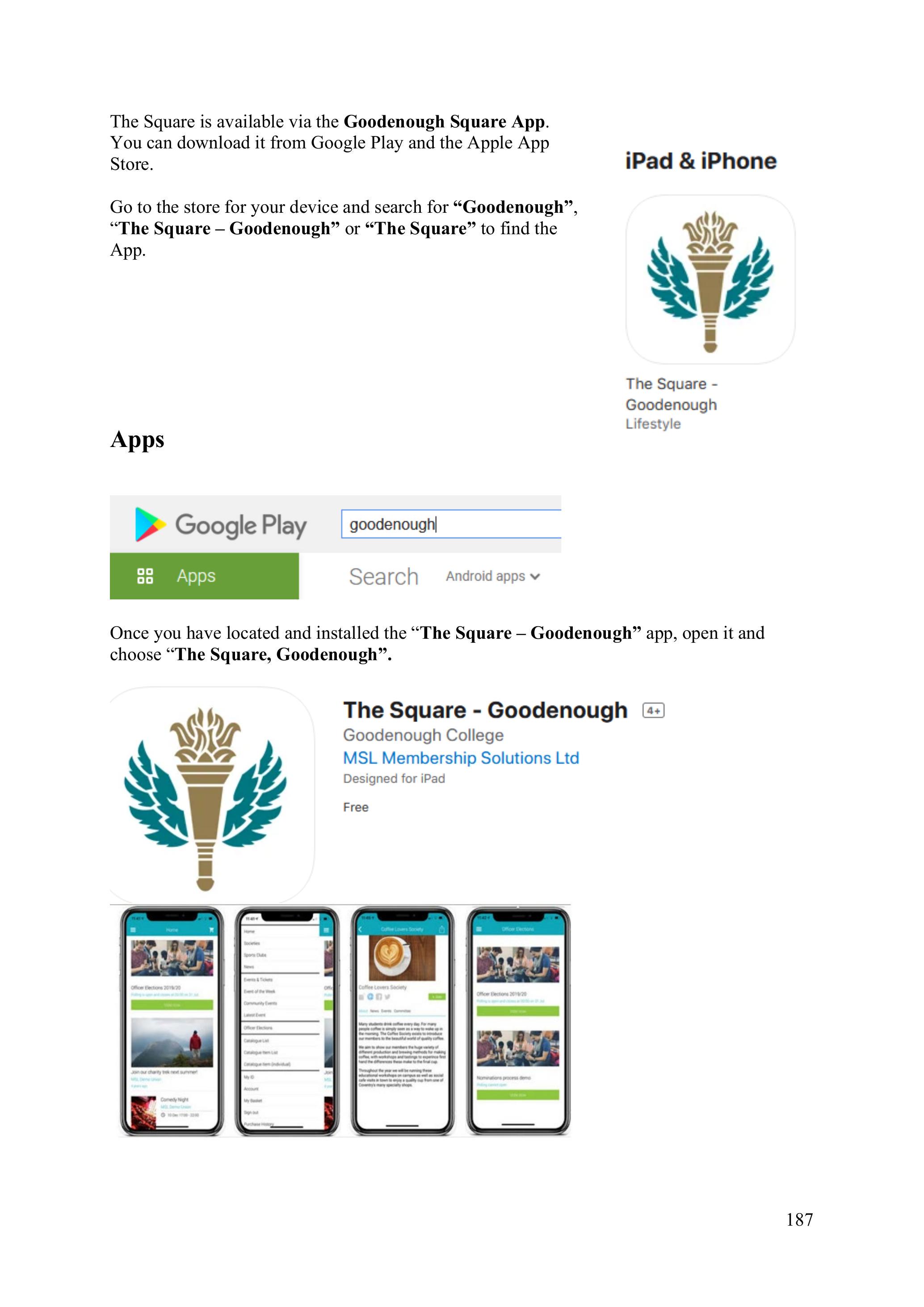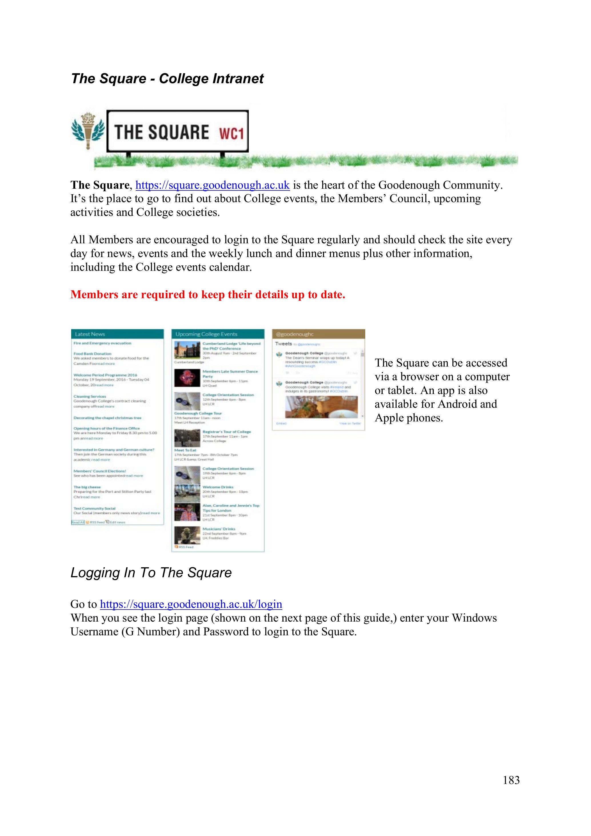 The Square is available via the Goodenough Square App. You can download it from Google Play and the Apple App Store.