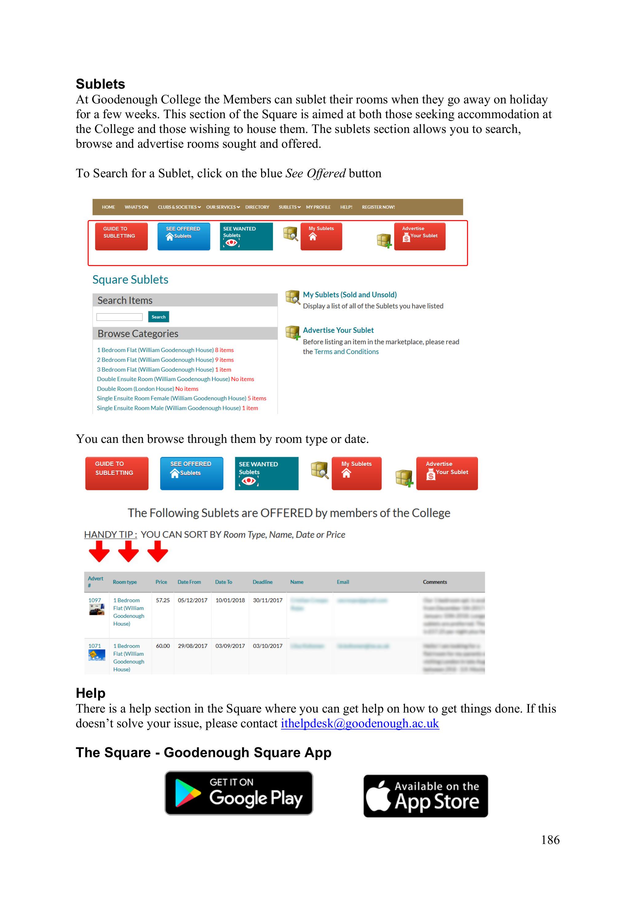 At Goodenough College the Members can sublet their rooms when they go away on holiday for a few weeks. This section of the Square is aimed at both those seeking accommodation at the College and those wishing to house them. The sublets section allows you to search, browse and advertise rooms sought and offered.