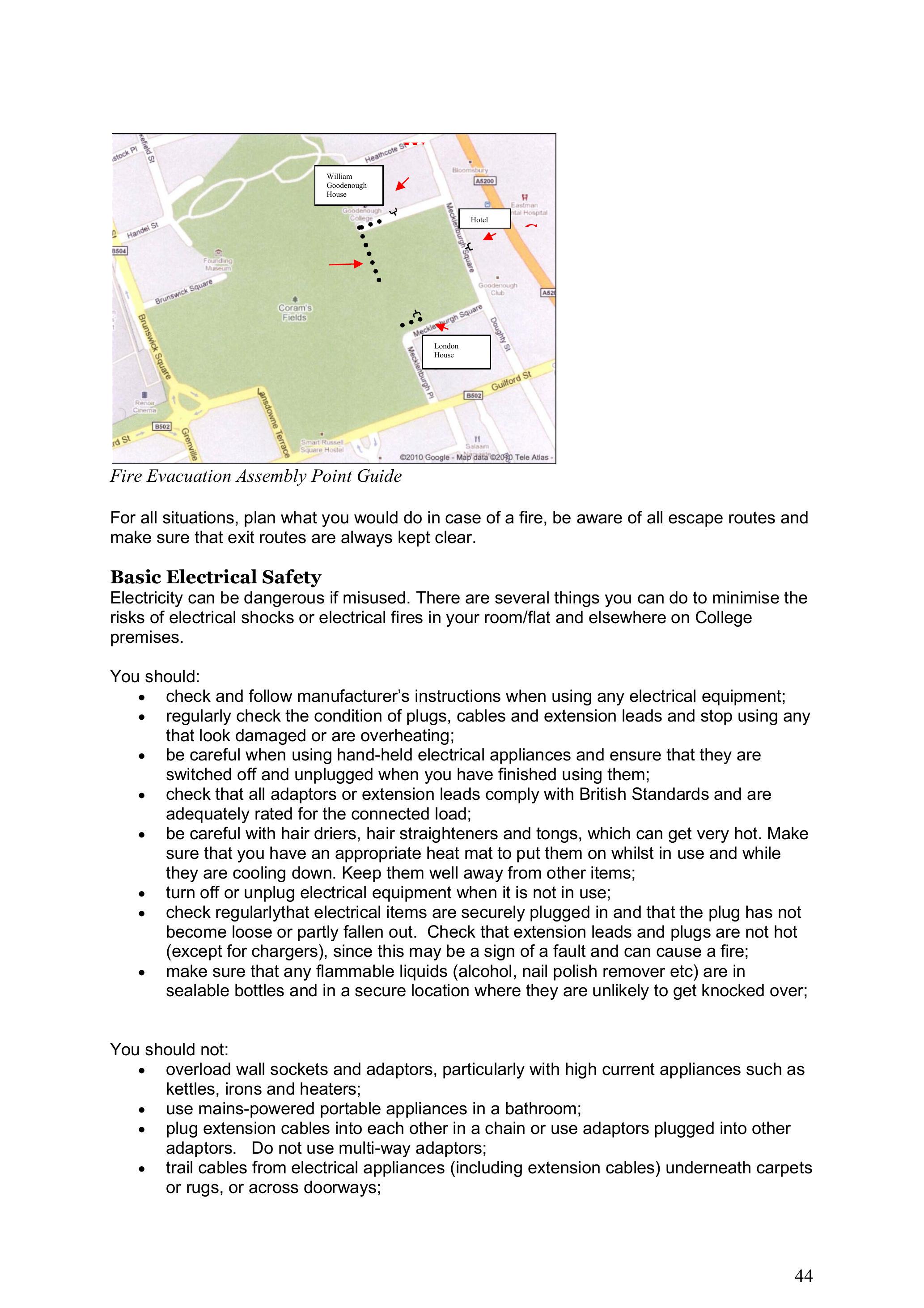 Detailed fire safety instructions are in every accommodation unit located on the back of every door. Please read them carefully. As you become familiar with the layout of your House, please note the location of the fire exits, particularly those closest to your room/flat. In the United Kingdom, it is your legal responsibility to familiarise yourself with the nearest means of escape.